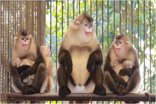 | 繁育 | 性成熟年龄:雌猴约3.5岁,雄猴约5.5岁。在交配期尾根周围性皮肤高度红肿。月经周期平均为31天。妊娠期170天左右。哺乳期6-8个月。多在凌晨生产,每胎产1仔,哺乳期为6-8个月。 |